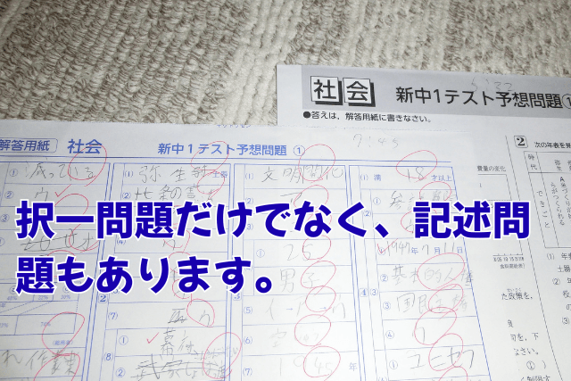 問題文と解答欄が別になっており、中学校の定期テスト形式に合わせた構成になっています。小学校のカラーテストとは異なるモノクロ印刷で、文章表現も中学校仕様。